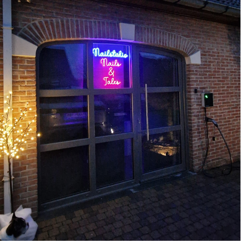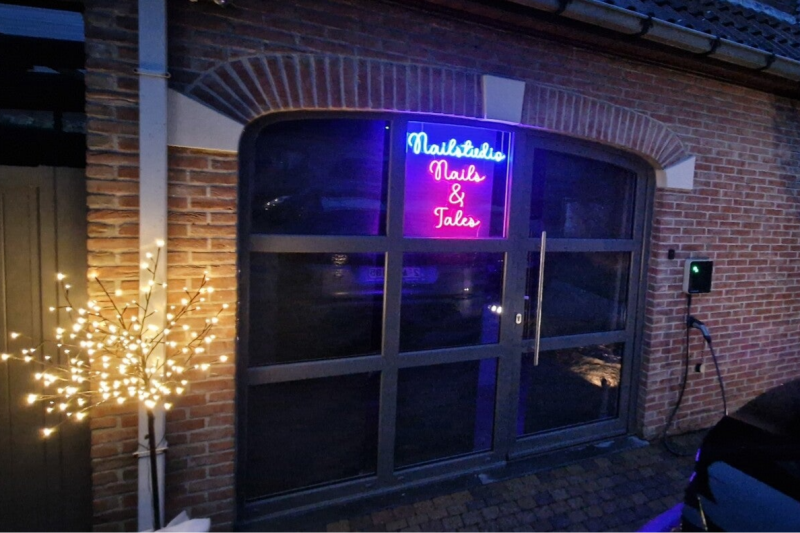 Zonder problemen zal de nagelstudio nu gevonden worden door de mooie zichtbare neonverlichting.